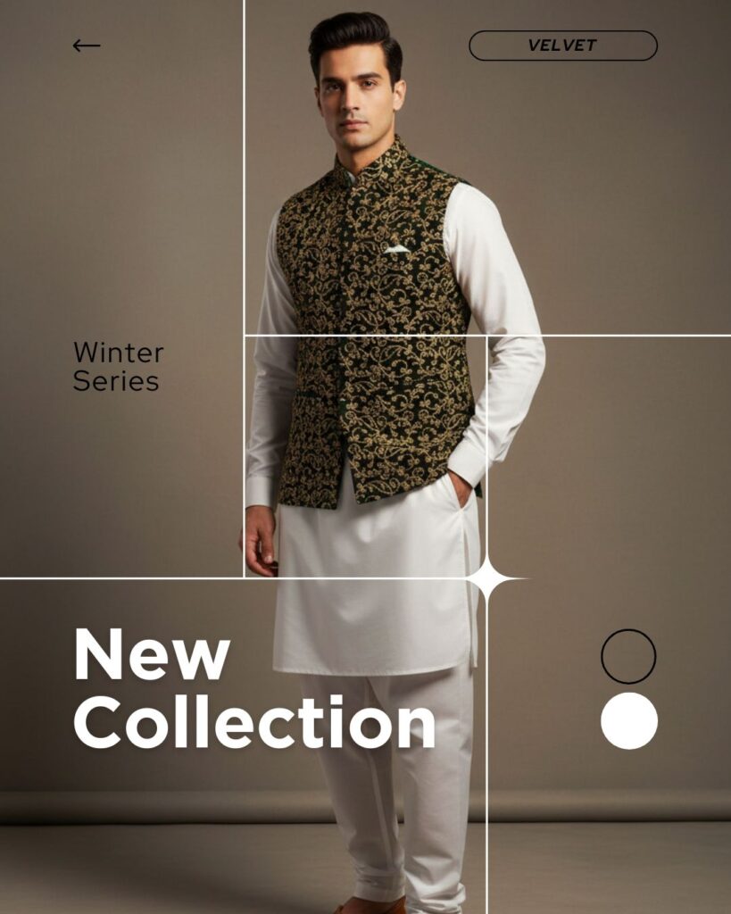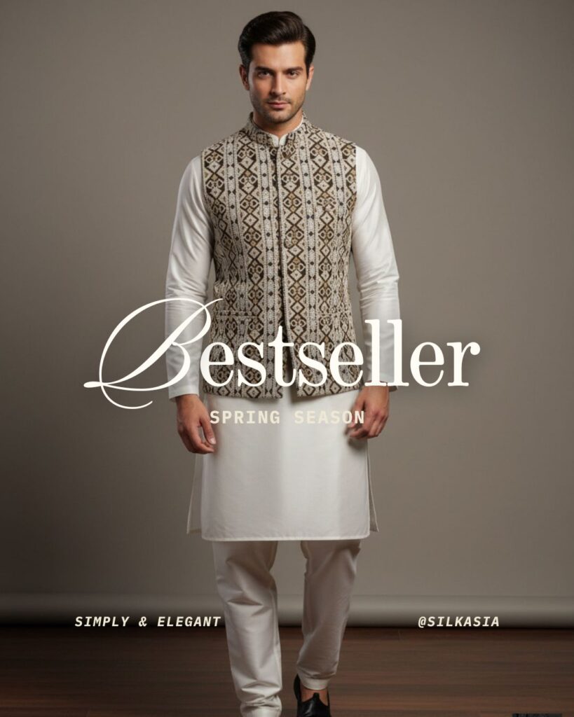 The key to a modern look is contrast. The mandarin collar (or band collar) of the waistcoat and the clean, long sleeves of the kurta create sharp vertical lines that are instantly flattering. The embroidered pattern adds texture, ensuring the simple white base is never boring.