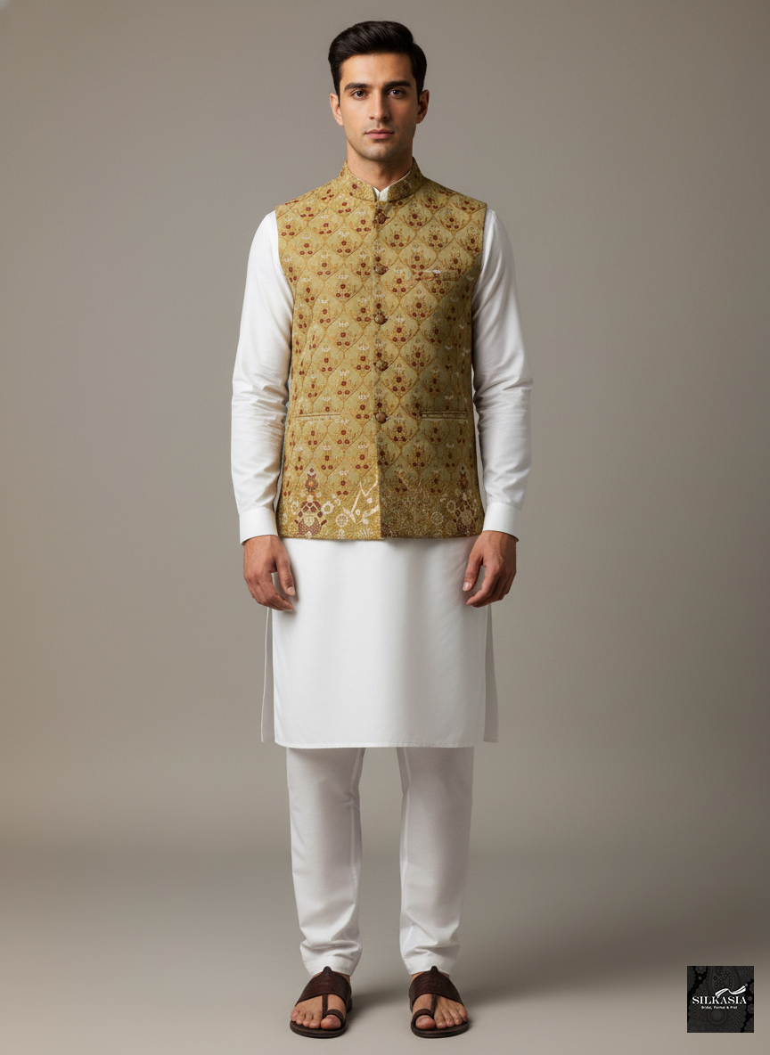 “Elevate your designs with our exquisite Copper Zari & Contrast Resham Embroidered Waistcoat Fabric! This stunning material features intricate detailing and rich texture, perfect for crafting luxurious men’s ethnic wear. The warm glow of copper zari combined with vibrant resham threads creates a truly captivating look, ideal for festive occasions, weddings, and high-end fashion. Offer your customers unparalleled elegance and traditional craftsmanship with this premium Waistcoat.”