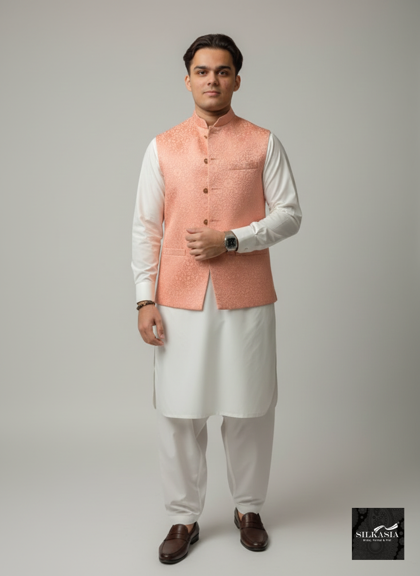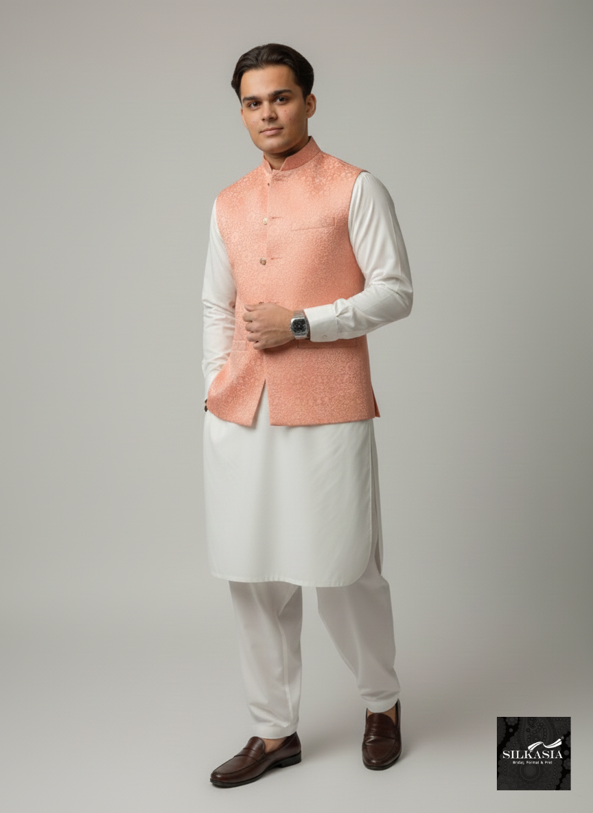 A masterclass in understated elegance. This peach embroidered waistcoat adds a soft, regal touch to the timeless white shalwar kameez. Clean lines meets heritage craftsmanship for the modern man.